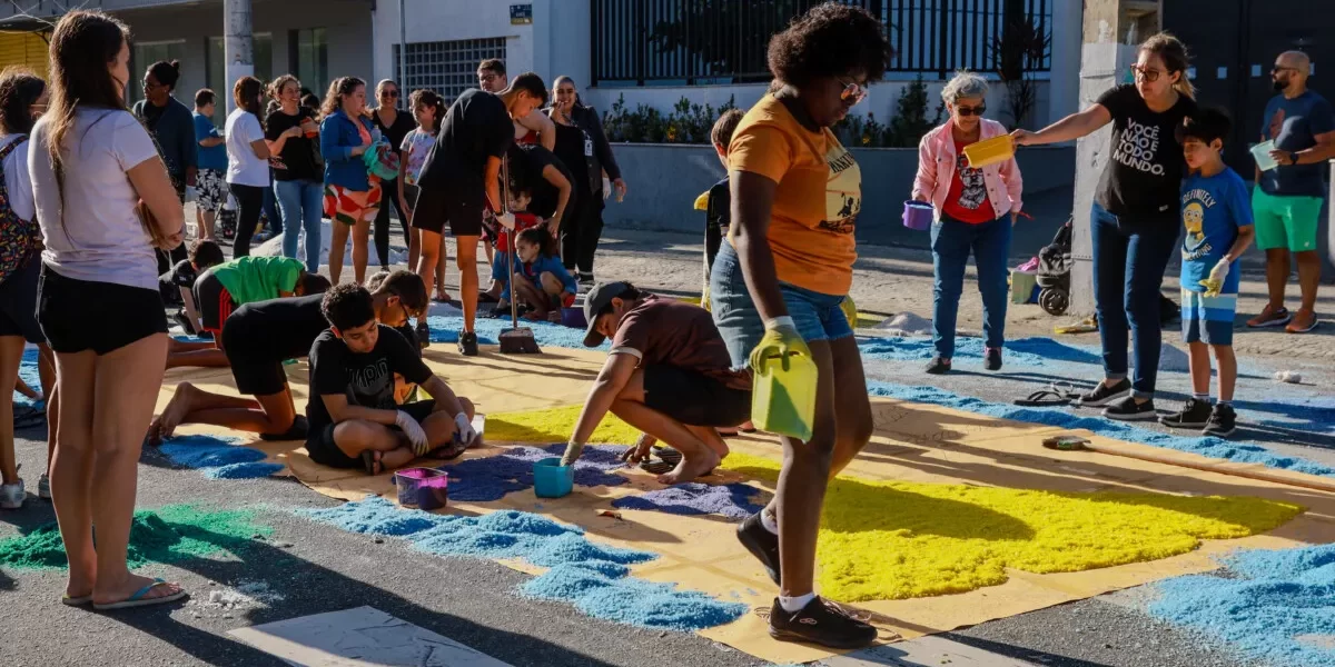 Além da confecção dos tapetes, a programação incluiu missa campal e procissão com o Santíssimo Sacramento, seguidas por um show especial na Praça Porto Rocha, encerrando o dia com música e integração da comunidade.