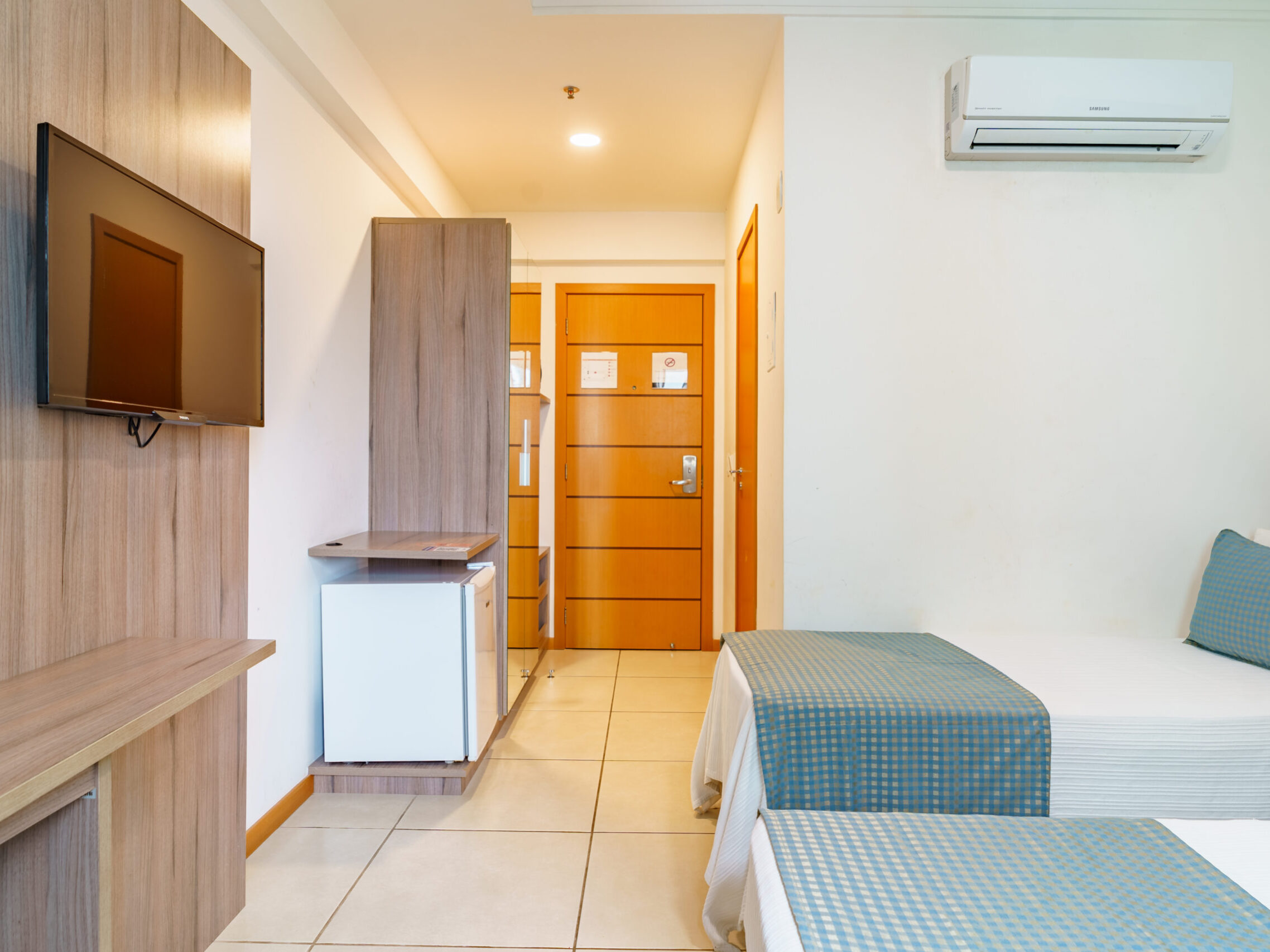 O ambiente climatizado proporciona uma estadia leve e aconchegante. Equipado com TV LED com canais a cabo, frigobar, mesa de trabalho, telefone, cofre e guarda-roupa, o quarto garante funcionalidade e comodidade no dia a dia.