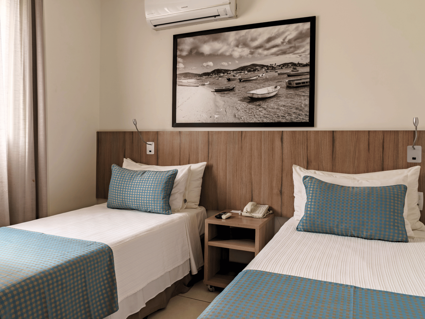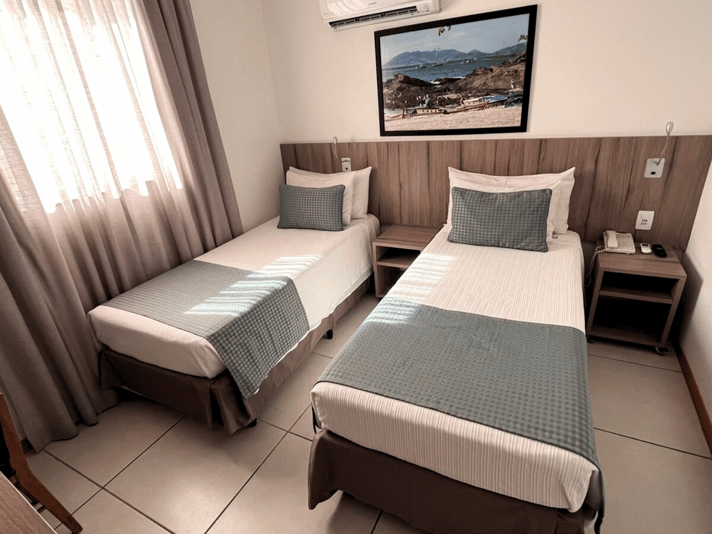 Com 17 m² de espaço bem distribuído, o Quarto Standard Twin é ideal para quem viaja acompanhado e busca praticidade sem abrir mão do bem-estar. Equipado com duas camas de solteiro, é perfeito para amigos, colegas de trabalho ou familiares em passagem por Cabo Frio.