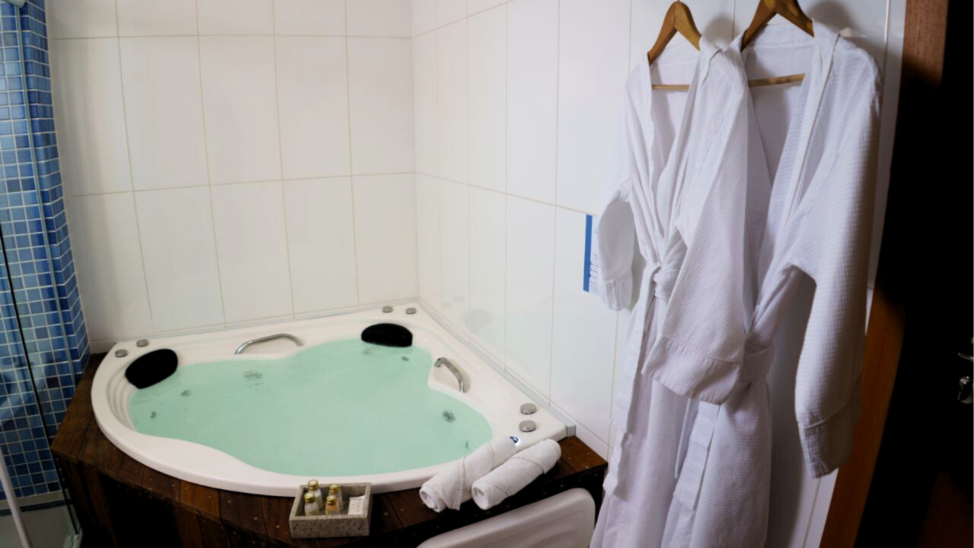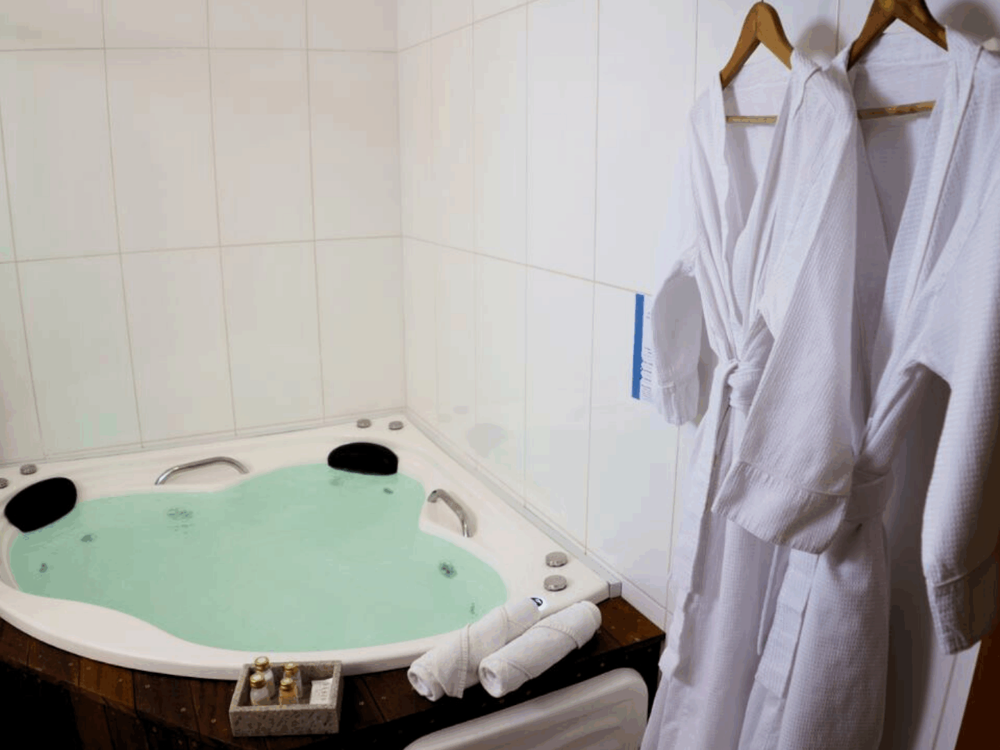 Além da hidro, o banheiro privativo oferece ducha quente, toalhas macias, secador de cabelo e amenities selecionados para seu conforto.